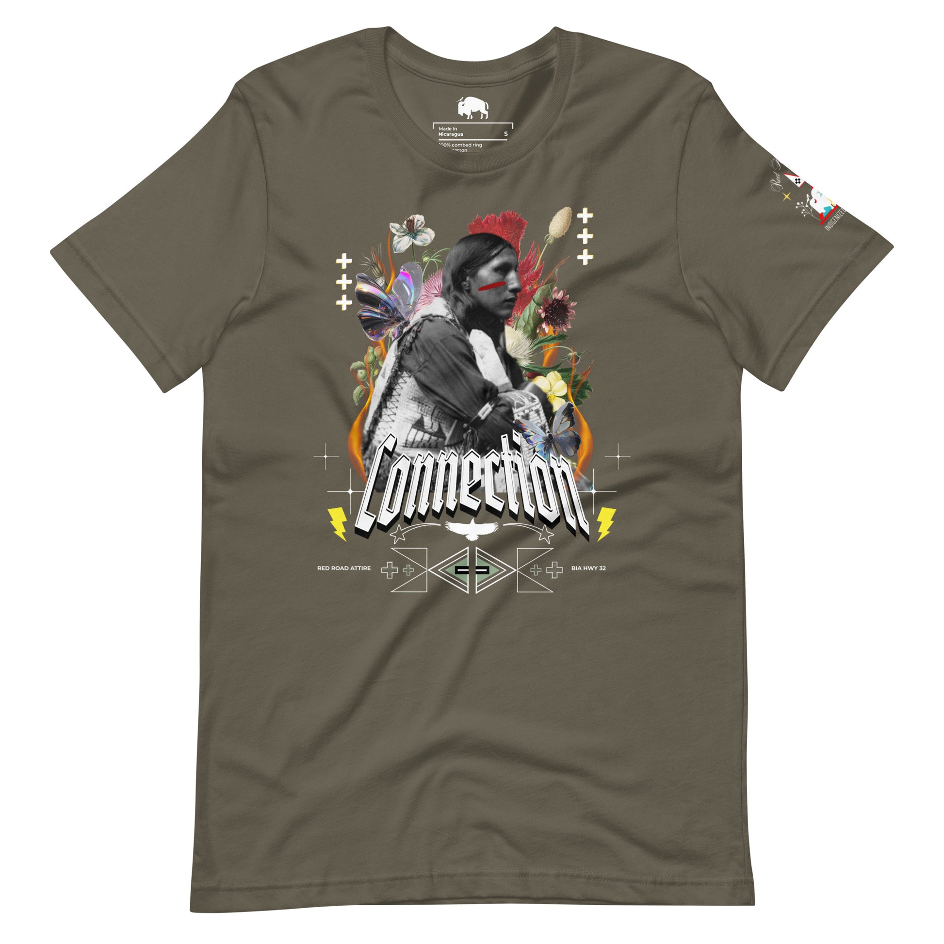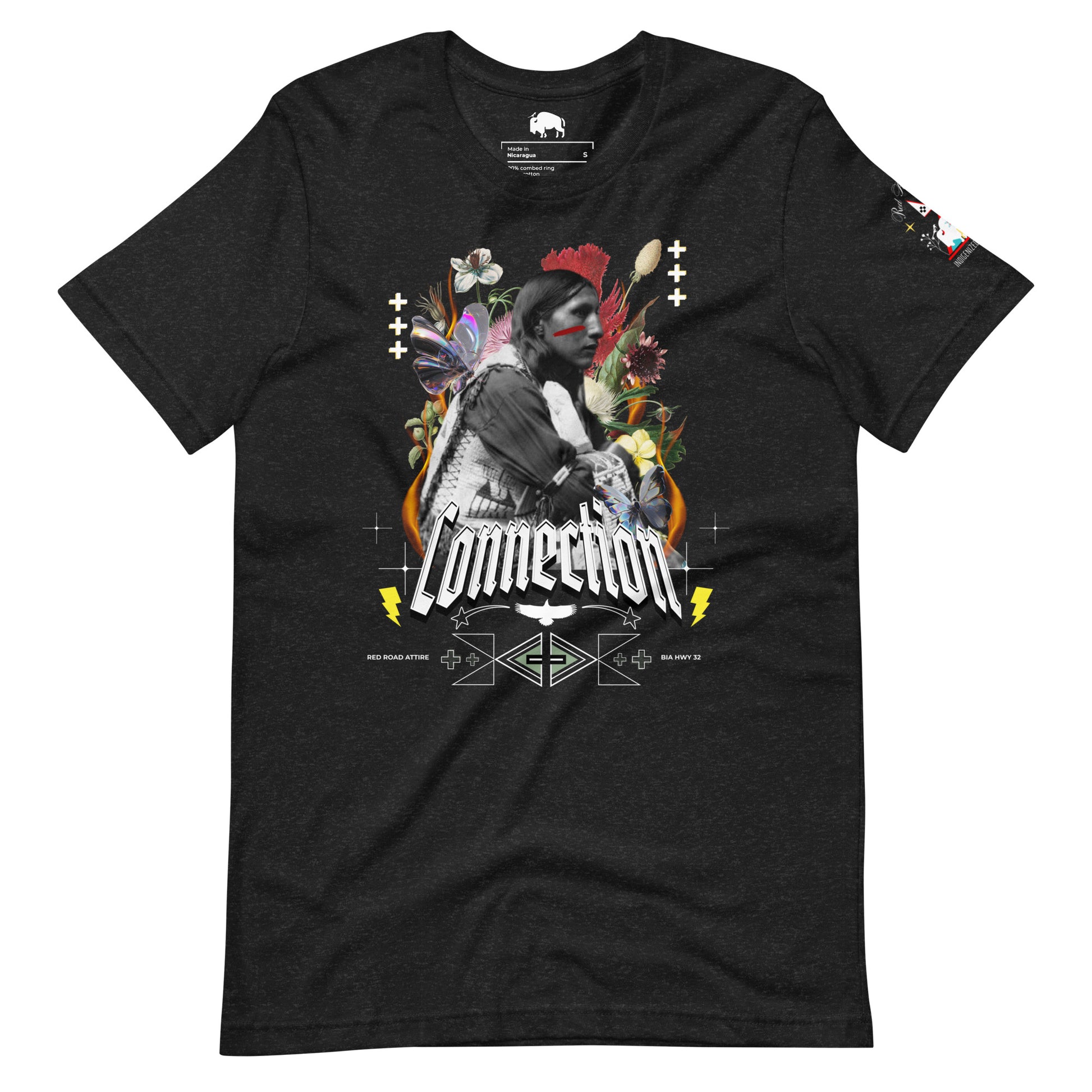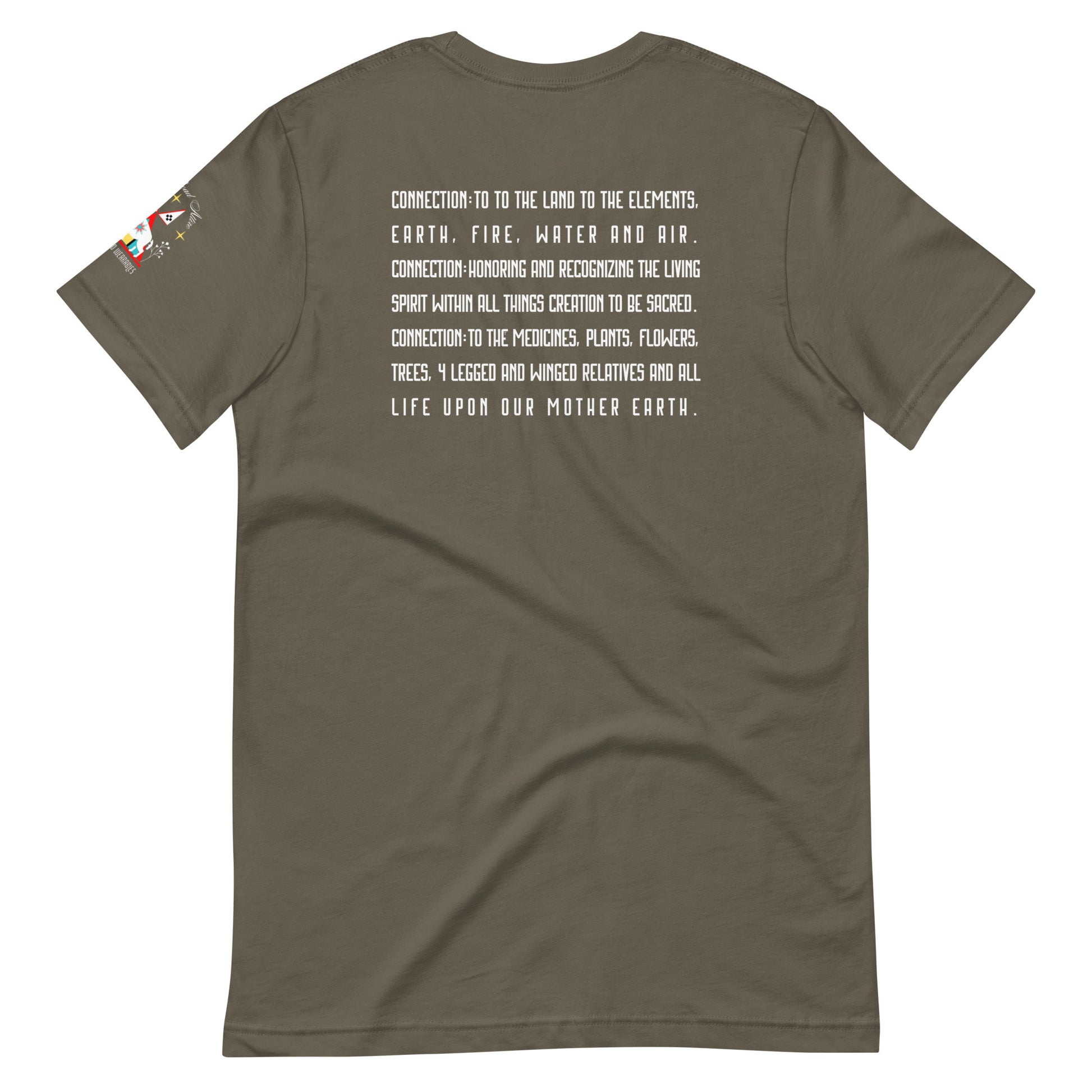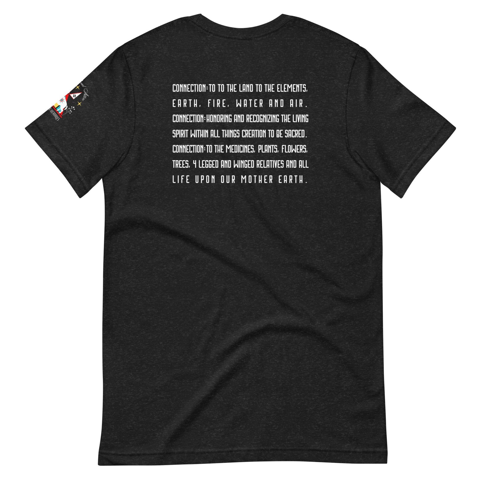 This t-shirt is everything you've dreamed of and more. It feels soft and lightweight, with the right amount of stretch. It's comfortable and looks good one everyone. even cooler This tee features our Connection to all things sacred design. We recognize our connection to Mother Earth, Fire, Water, Air and all life that dwells upon creation. We say it not only with out voices but with what we wear. This design features Oglala Lakota Ancestor Poor Elk.