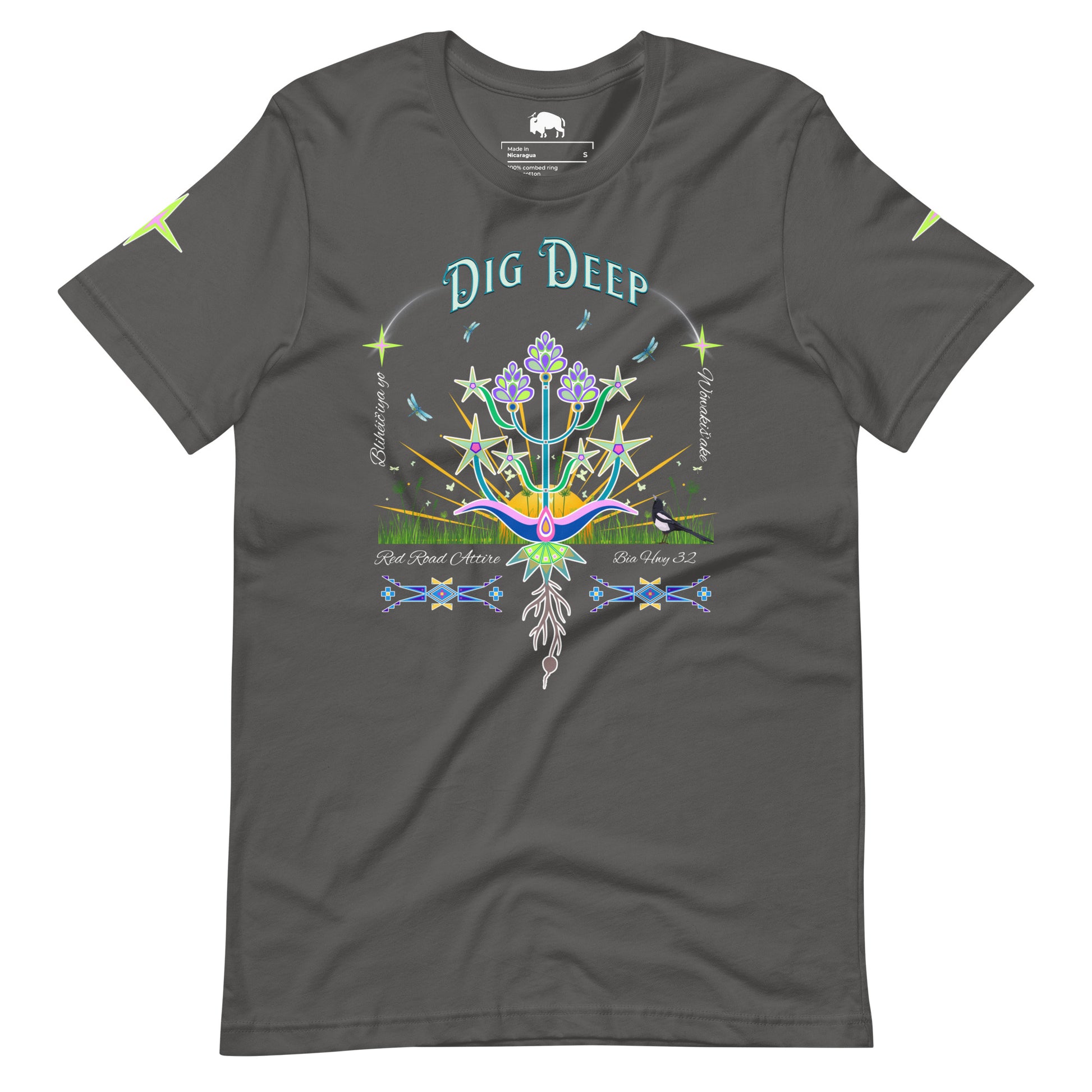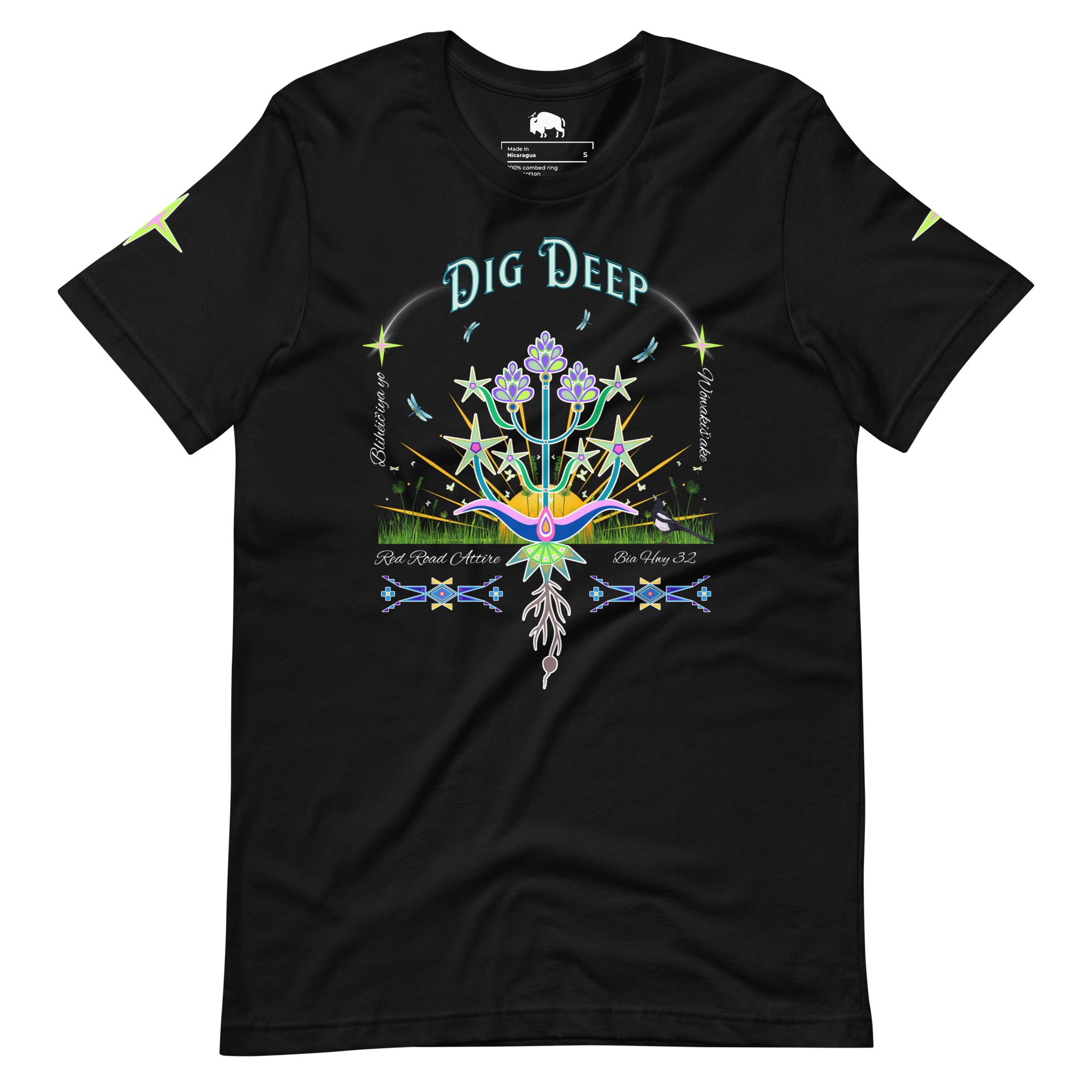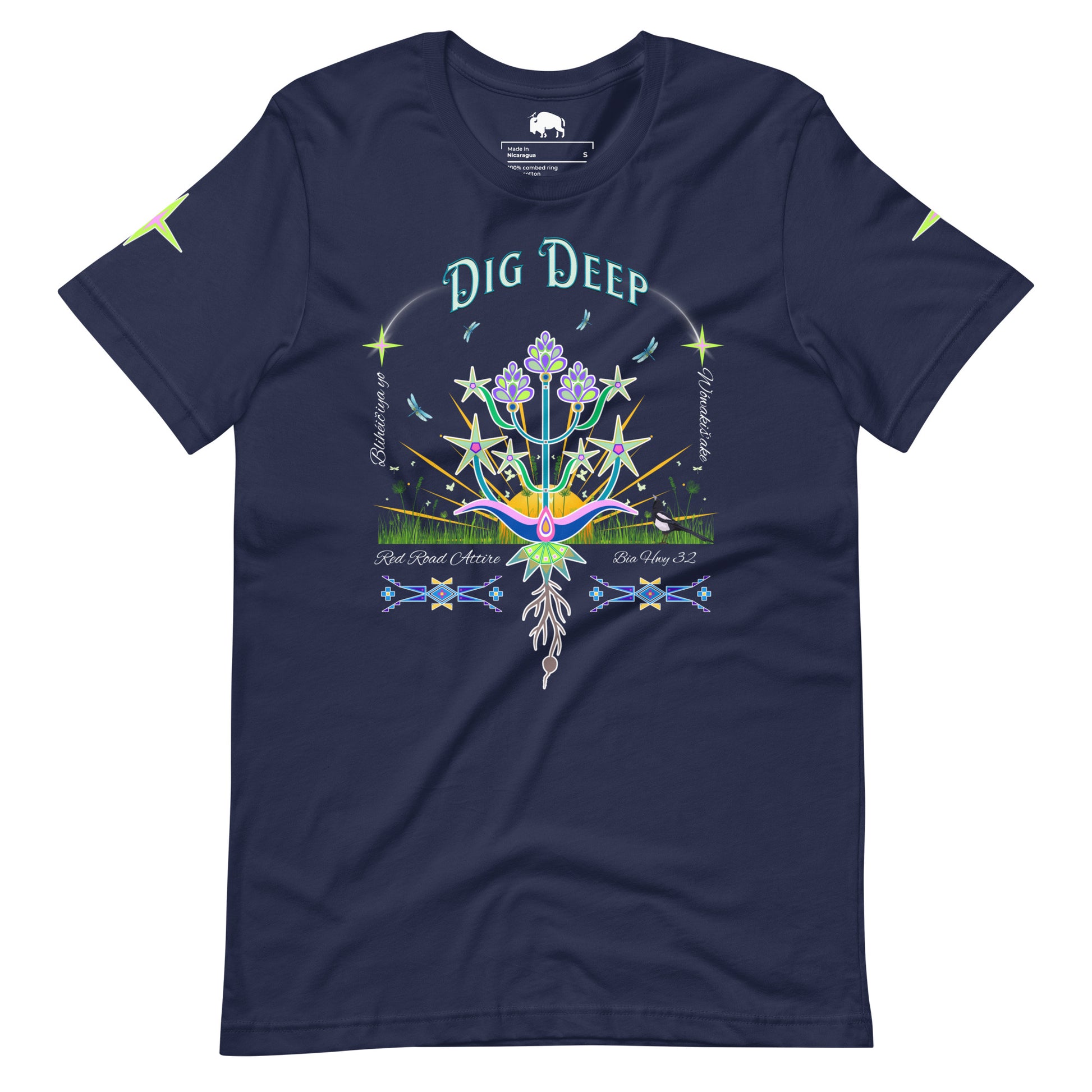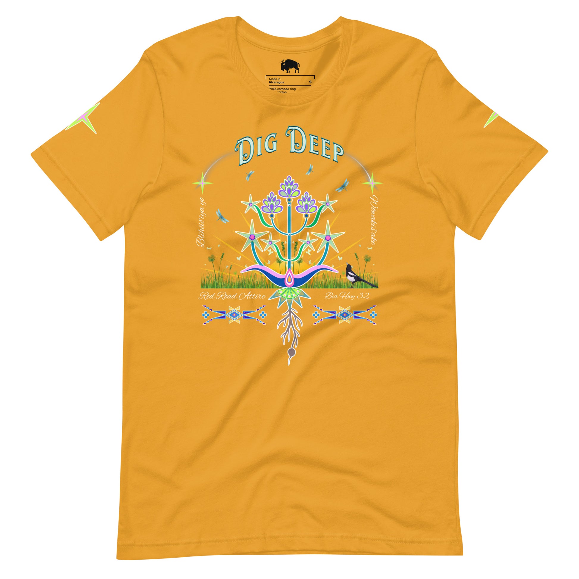 This designs features a RRA original design in Traditional Lakota florals features shooting starts which honor the story the girl who married star boy and how Thinpsinla covered the lands. we also included Lakota language words of encouragement , Bliheiciya Yo (do your best) and Wowakis-ake (to have endurance and resilience) we believe as language learners that we need to normalize language everywhere in all the spaces we can manage to do that, this includes the apparel world! These tees are comfy and durable and will be a fayyyyve. Lets DIG DEEP!