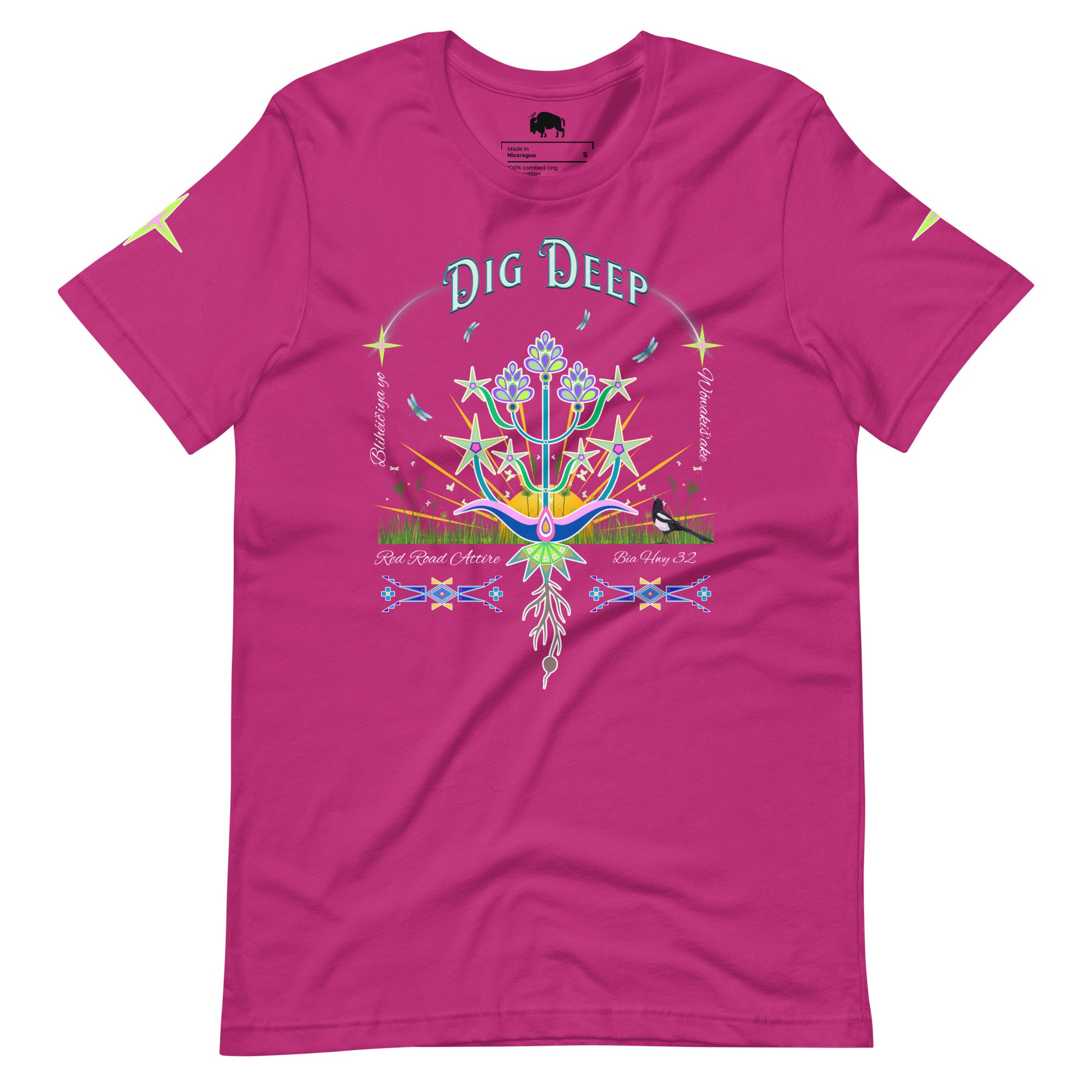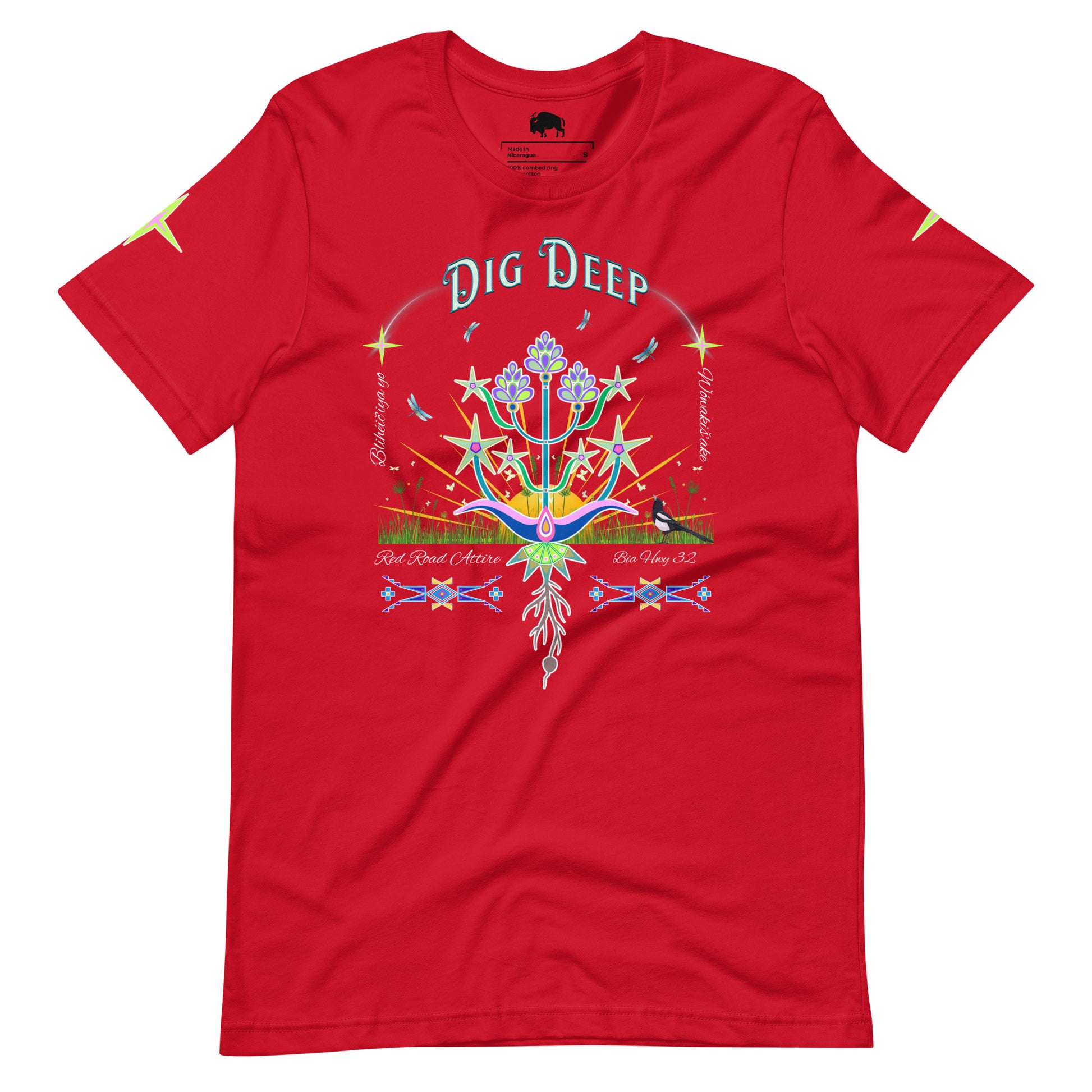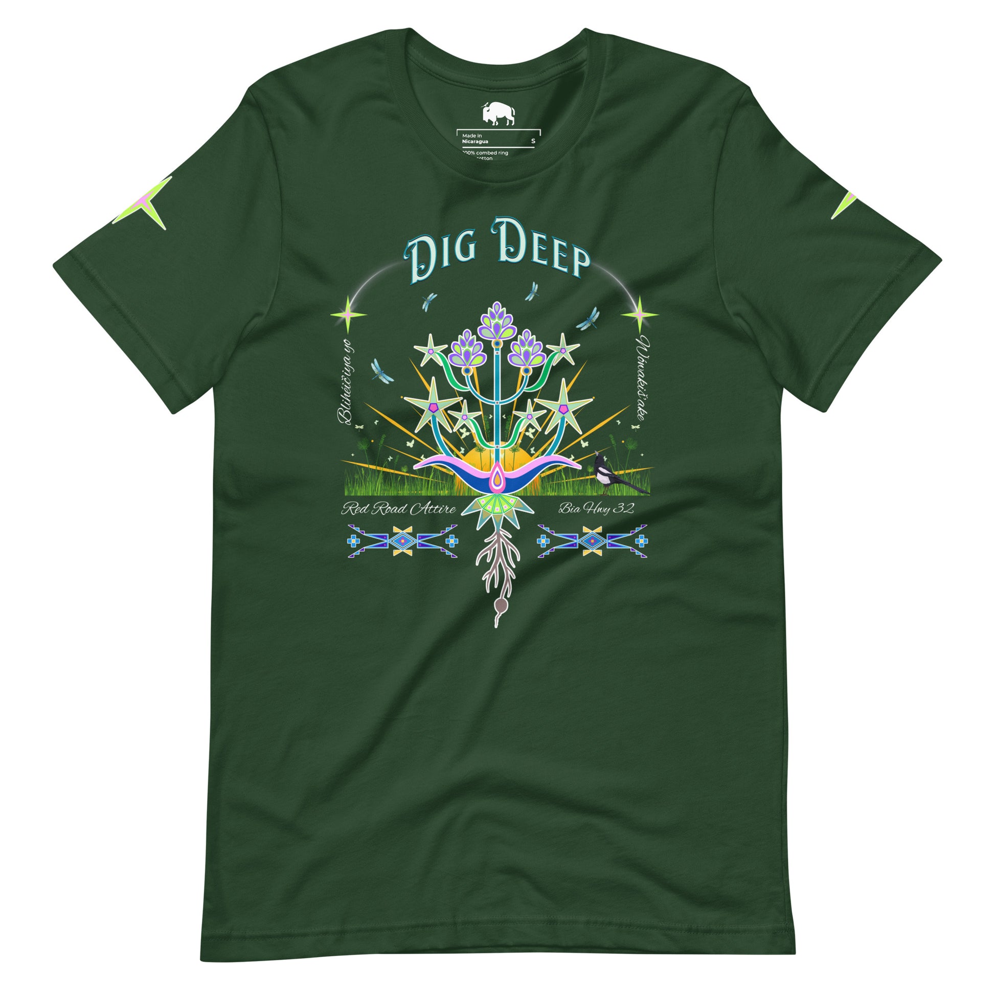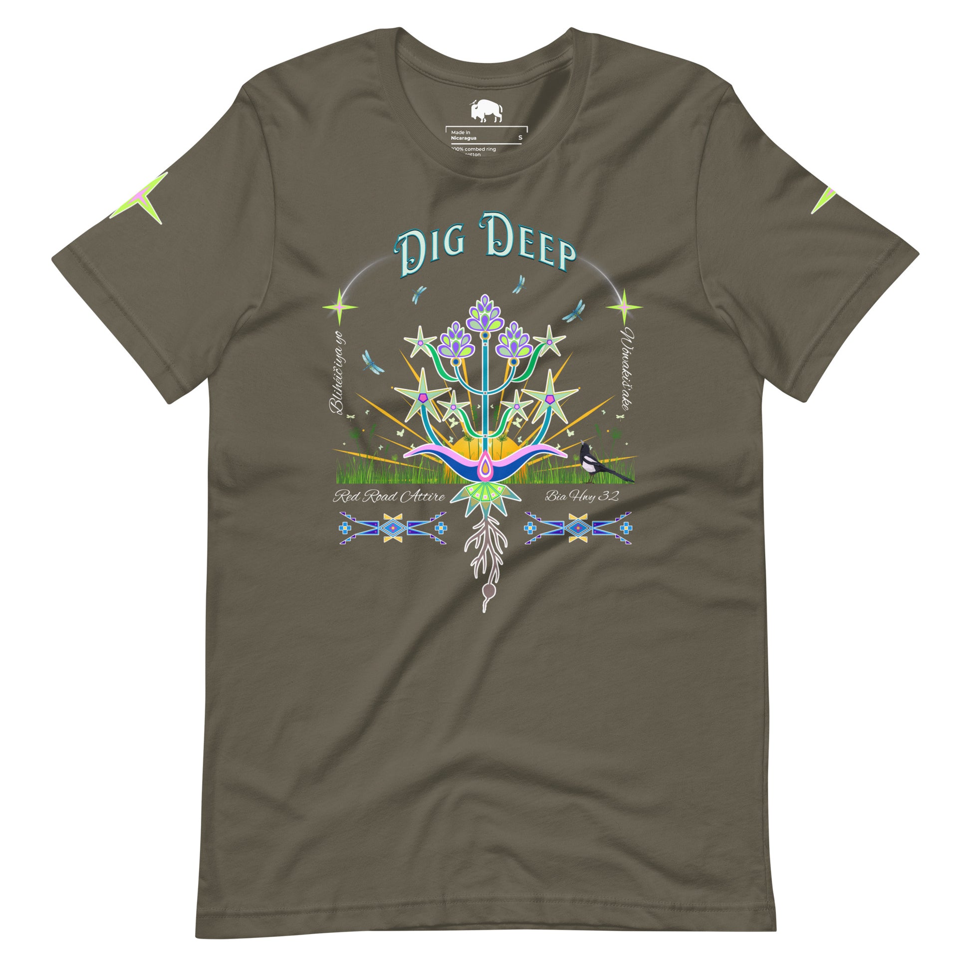 This designs features a RRA original design in Traditional Lakota florals features shooting starts which honor the story the girl who married star boy and how Thinpsinla covered the lands. we also included Lakota language words of encouragement , Bliheiciya Yo (do your best) and Wowakis-ake (to have endurance and resilience) we believe as language learners that we need to normalize language everywhere in all the spaces we can manage to do that, this includes the apparel world! These tees are comfy and durable and will be a fayyyyve. Lets DIG DEEP!