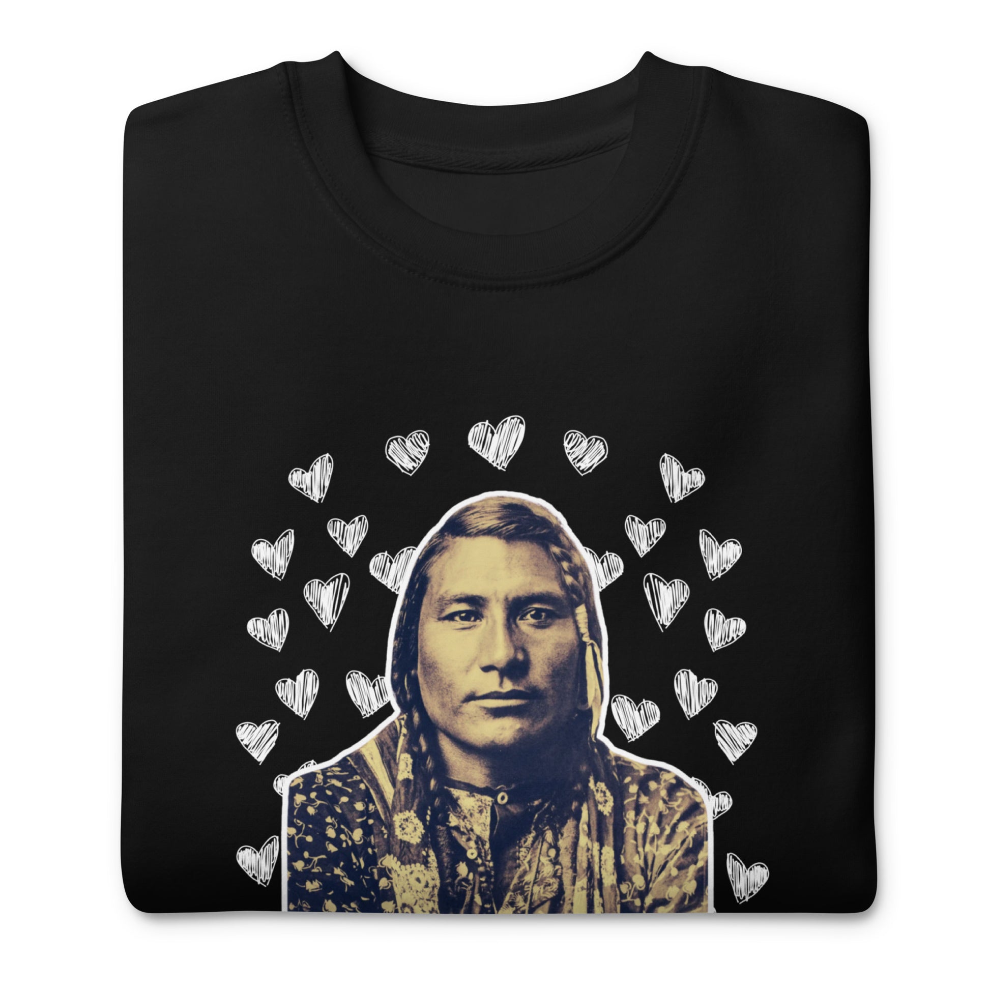 Rock a classic sweatshirt silhouette with ribbed crew neck, long sleeve cuffs, and a flat hem. Layer it up or wear it on its own for a contemporary streetwear look. With the soft fleece inside and comfortable fit and it features this Red Road Attire Original design just in time for the Valentines day, were indigenizing everything including old time courting and remembering how our ancestors did it by gifting horse's before flowers became the thing to do. This sweater is sure to become your favorite everyday sweater right away!